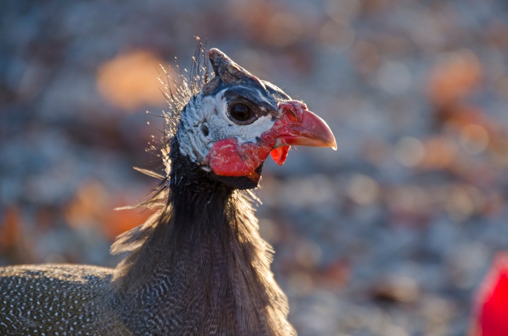 Our house, barn, and chickens, have been adopted by a stray Guinea fowl.