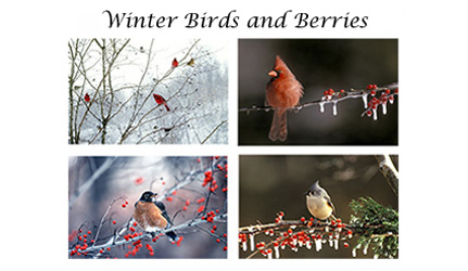 3 each of: Songbirds in Birch Tree, Cardinal with Iced Berries, Robin on Hawthorne, Tufted Titmouse with Berries